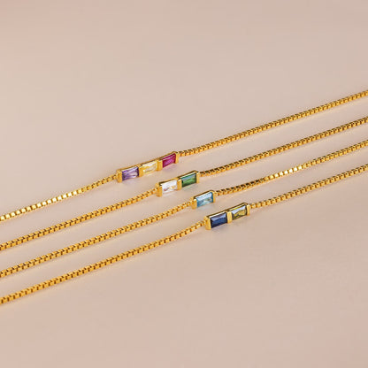 Our custom Multiple Baguette Birthstone Bracelet with a box chain is a chic and versatile piece that lets you choose up to five birthstones to craft the perfect look _ It's a lovely addition to celebrate your loved ones or add a personal flair to your look!